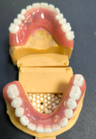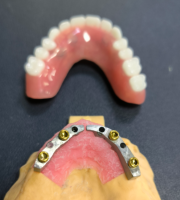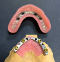 WM fogászati ​​labor teljes boltív helyreállítás CADCAM titán Ibar lokátorral elhelyezve és kivehető fogsor felett, osztott rúd megoldás a nem gyakori behelyezési útvonalhoz